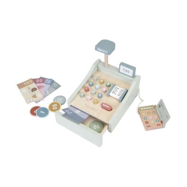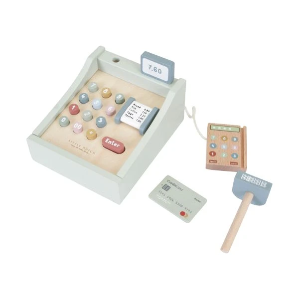 Met de Little Dutch Houten Kassa kan je kindje winkeltje spelen. Scan de producten en bereken wat je klanten moeten betalen. De houten kassa van Little Dutch heeft een pinautomaat. muntgeld en bankbiljetten. Ook is de kassa voorzien van een lade waar je kindje het geld in op kan bergen. De speelgoedkassa zorgt er niet alleen voor dat je kindje urenlang plezier kan maken, maar je kindje leert ook zijn of haar motorische en sociale vaardigheden te ontwikkelen. Verder is de kassa voorzien van een prachtig ontwerp en gemaakt van hoogwaardig materiaal.
