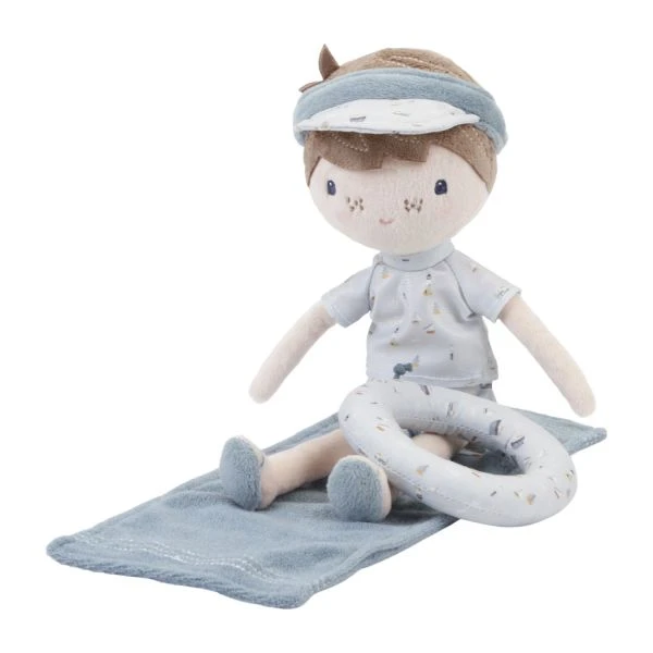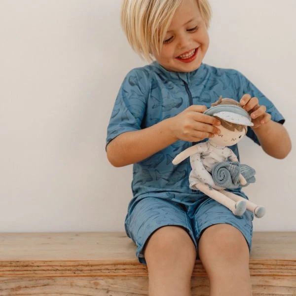 De Little Dutch Zomerpop – Jim is een vrolijke pop waar je kindje uren mee kan spelen en knuffelen. Jim is helemaal klaar voor het zomerse weer met zijn stoere zwempak, zonneklep en slippers. Ook is de lieve pop voorzien van een zwemband en handdoek. Neem Jim mee naar het strand of het zwembad en je kindje zal zich de hele dag vermaken. Daarnaast is de knuffelpop 35 cm lang en wordt ze geleverd in een opbergdoos. Verder is de pop gemaakt van hoogwaardig en zacht materiaal.