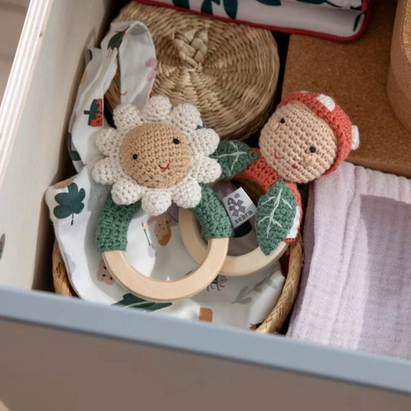 De Sebra Flower Ringrammelaar is een vrolijke en leuke rammelaar. De gehaakte rammelaar is gemaakt van comfortabel en zacht materiaal, zodat je kindje er mee kan knuffelen. Als je het hertje heen en weer beweegt gaat het rammelen, dat zorgt voor een leuk geluid en het stimuleert de zintuigen van je kindje. Kortom de ideale rammelaar voor je kindje of om weg te geven als cadeau!