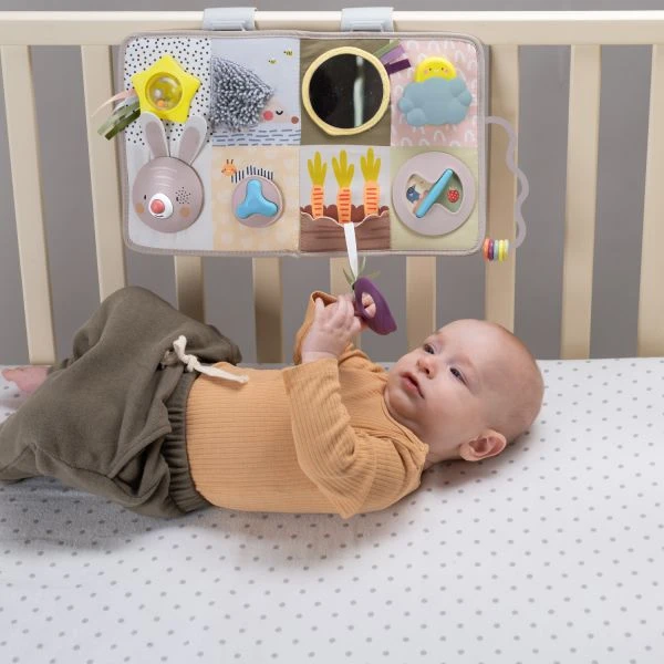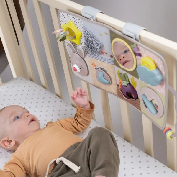 Het Taf Toys Urban Garden Activity Center zit vol met 13 leuke activiteiten die je kindje kan ontdekken! Het centrum is te gebruiken in verschillende levensfases van je kindje. De volgende ontwikkelingsactiviteiten zijn te vinden op de speelmat: muziek en lichtgevend konijntje, kiekeboe-activiteiten, een ster met kleurrijke lintjes en een rammelend balletje, een ratelrupsje, baby spiegel, een doolhof met kleurrijke ringetjes, een egel met een zachte structuur en een bijtring in de vorm van een biet. Door hiermee te spelen ontwikkelt je kindje zijn of haar fijne en grove motoriek en oog-handcoördinatie. Verder kan het activiteitencentrum eenvoudig aan de zijkant van de wieg of box worden bevestigd.
