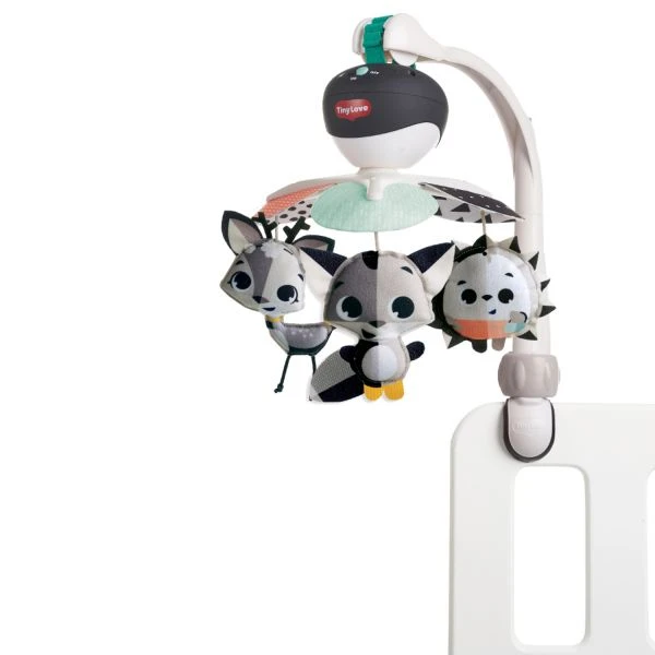 De Tiny Love Black & White Take Along Muziekmobiel stimuleert de ontwikkeling van je kindje. Met de universele klem kan je de muziekmobiel eenvoudig vast maken aan de wieg of campingbedje. De vrolijke muziekmobiel beschikt over vijf melodieën die je tot dertig minuten achter elkaar kan afspelen op het gekozen volume. Zo kan je de muziekmobiel aan zetten voor je kindje gaat slapen. Aan de arm hangen verschillende knuffeltjes die rond draaien boven je kindje in de wieg. Dankzij het compacte formaat en handige clip kan de mobiel ook zonder arm aan de kinderwagen of autostoel worden bevestigd.