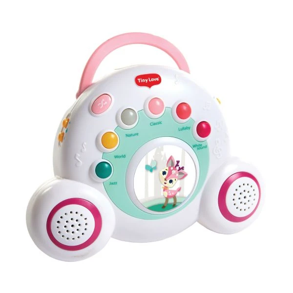De Tiny Love Princess Tales Soothe ’n Groove Muziekmobiel stimuleert de ontwikkeling van je kindje. De vrolijke muziekmobiel beschikt over achttien melodieën in zes verschillende categorieën. De geluiden kunnen tot veertig minuten achter elkaar worden afgespeeld op het gekozen volume. Zo kan je de muziekdoos aan zetten voor je kindje gaat slapen. Aan de arm hangen verschillende knuffeltjes die rond draaien boven je kindje in de wieg. Wanneer je kindje ouder is kan de muziekdoos ook zonder arm worden gebruikt. Door middel van de knopjes kan je kindje de muziekdoos zelf aanzetten en ontdekken.
