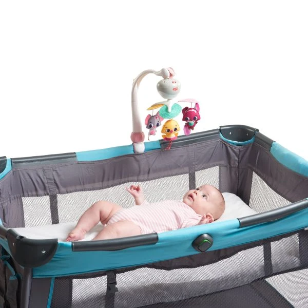 De Tiny Love Tiny Princess Tales Take Along Muziekmobiel stimuleert de ontwikkeling van je kindje. Met de universele klem kan je de muziekdoos eenvoudig vast maken aan de wieg of campingbedje. De vrolijke muziekmobiel beschikt over vijf melodieën die je tot dertig minuten achter elkaar kan afspelen op het gekozen volume. Zo kan je de muziekdoos aan zetten voor je kindje gaat slapen. Aan de arm hangen verschillende knuffeltjes die rond draaien boven je kindje in de wieg. Dankzij het compacte formaat en handige clip kan de muziekdoos ook zonder arm aan de kinderwagen of autostoel worden bevestigd.
