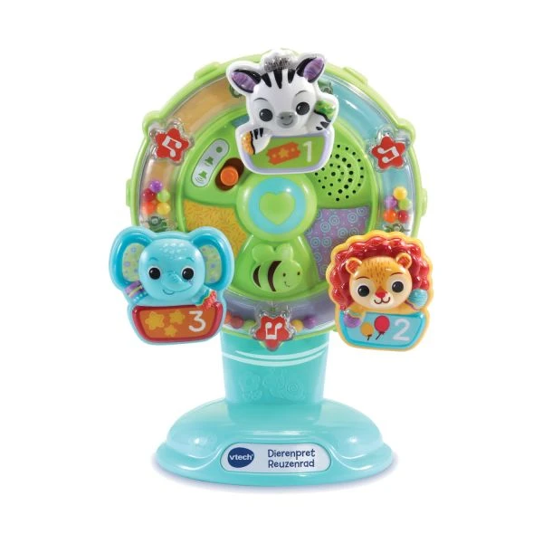 Met het Vtech Dierenpret Reuzenrad kan je kindje heerlijk spelen! Het reuzenrad is voorzien van verschillende dieren, cijfers en kleuren. Wanneer je op de knoppen drukt, beginnen de dieren allerlei geluiden te maken. Het reuzenrad heeft de mogelijkheid om 4 gezongen liedjes en 10 verschillende melodieën af te spelen. Door middel van de zuignap onder het reuzenrad is hij stevig te bevestigen op bijvoorbeeld de tafel of kinderstoel. Gemaakt van hoogwaardig materiaal en geschikt voor kindjes vanaf 6 maanden.