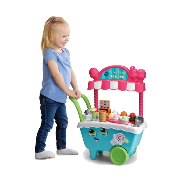 Met deze te gekke ijscokar van Vtech kan je kindje zich uren vermaken! De ijscokar beschikt over een interactieve ijslepel die de verschillende smaakjes en toppings herkent. Met behulp van de 6 dubbelzijdige kaarten kunnen er veel bijzondere ijscreaties gemaakt worden. Plaats een kaart in de kassa en maak de bestelling klaar! Door de kaarten te gebruiken leert je kindje tellen en wordt er kennis gemaakt met verschillende kleuren, smaakjes en dieren. Wanneer je de ijscokar vooruit duwt hoor je vrolijke liedjes en muziek. De muziek wordt na een bepaalde tijd automatisch uitgeschakeld. Verder is de kar gemaakt van hoogwaardig en duurzaam materiaal en geschikt vanaf 2 tot 5 jaar.